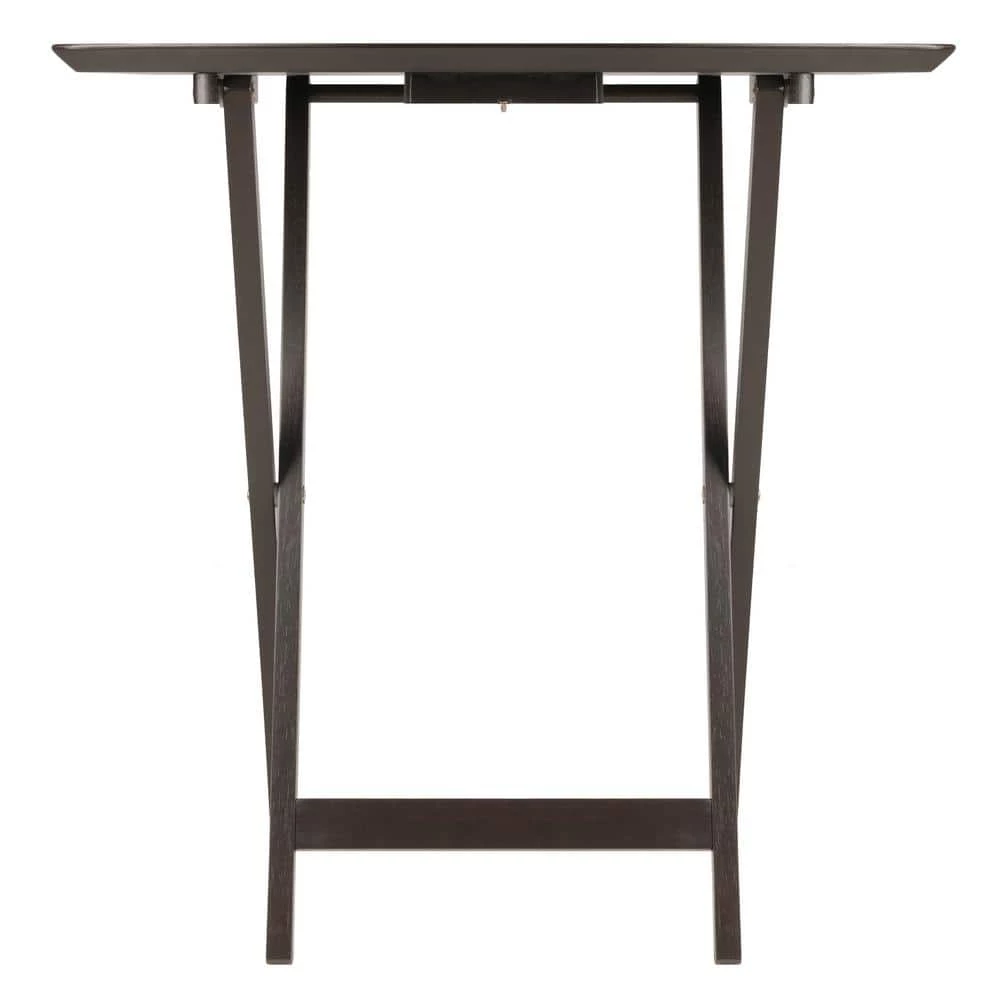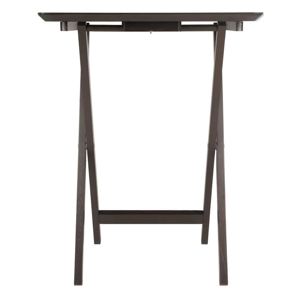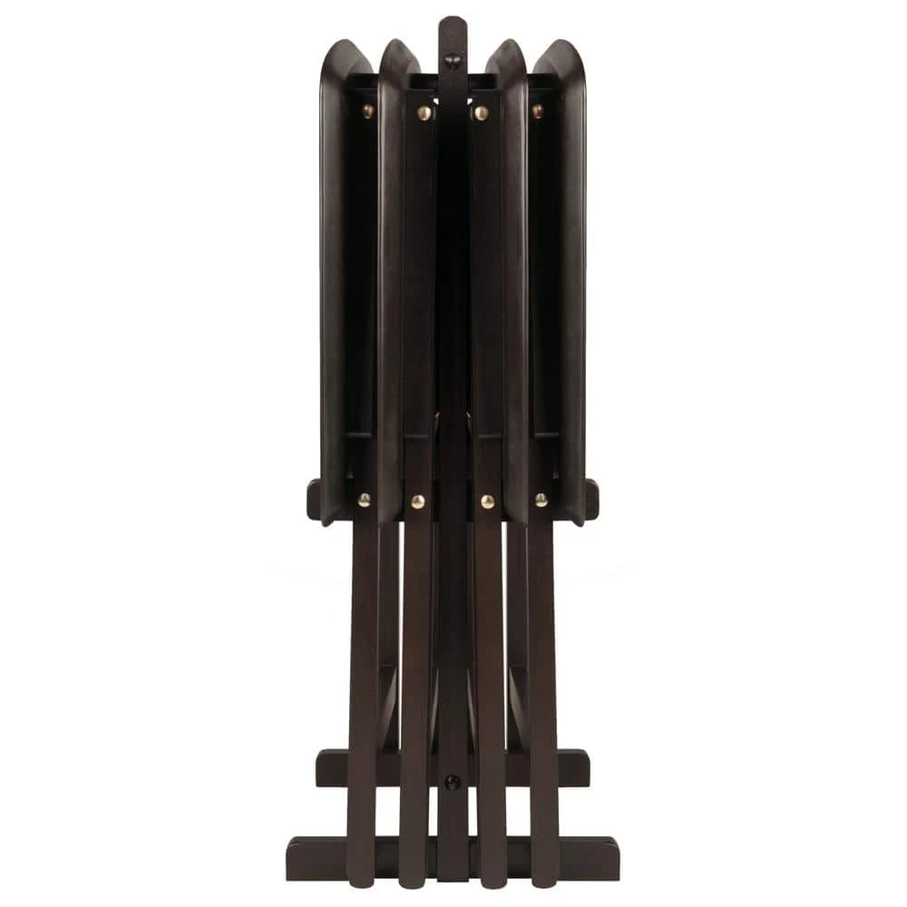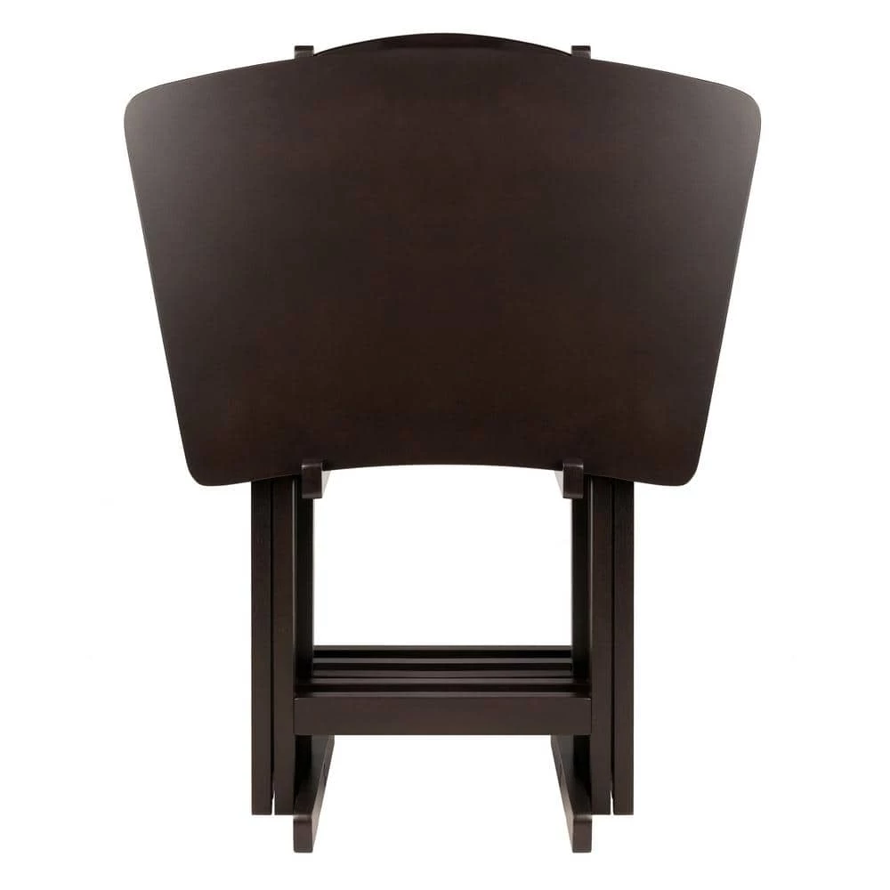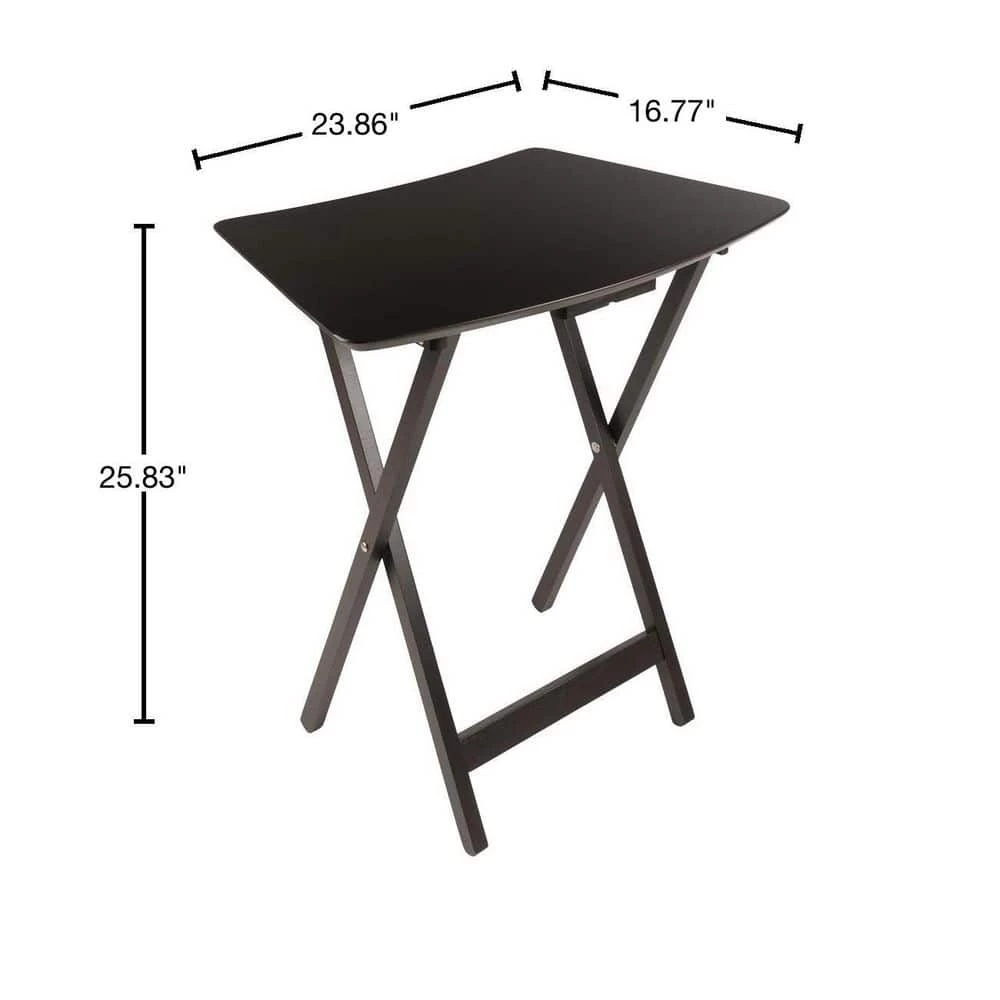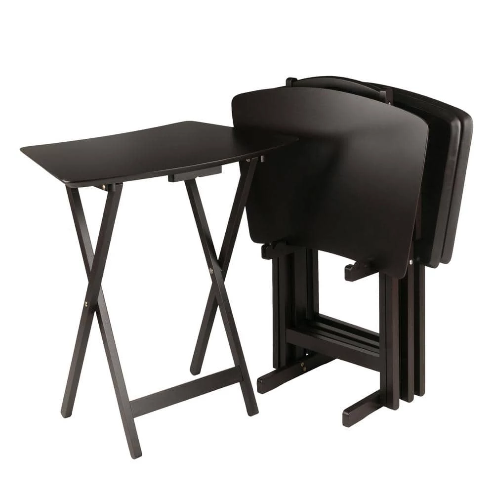 Make entertaining simple and easy with the Winsome Wood Anila 5-Piece Snack Table set. A perfect companion-Piece for a casual meal in front of the TV or on the patio. These Anila snack tables bring a distinct and enchanting new look to TV trays. This versatile set includes four folding snack trays with beveled edges that show off the gently curved fan shape, and with the longer arc you get even more tabletop space. Ideal for entertaining, setting out appetizers, so bring out the set and pull up the tables as you and your guests sit back with these lovely designed tables on which to place their drinks and plates. Great for daily use and compact enough to store in the closet. For convenience an upright stand is an innovative addition to this set as it serves as a rack to store the folded tables discretely when not in use. Constructed of solid and composite wood in a deep coffee finish, this set of foldable tables easily open up to X-frame bases which make these table not only look good but also help with stability. Conveniently packed and shipped in 1-box. Tables arrive ready to use and require no assembly. Minimal assembly is required for the stand and hardware necessary is included. Replacement part request can be submitted directly to the manufacturer within 60-days from date of purchase.
