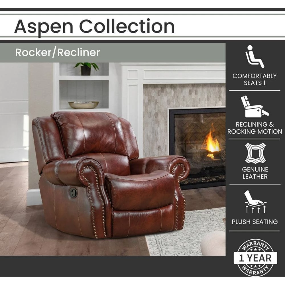 Blending quality, comfort, and style, the Aspen Collection by Hanover will add rustic warmth to any room in your home. Boasting long-wearing 100% genuine leather fabric and luxe nailhead trim, this rocker/recliner will be part of your movie nights for years to come. The wall-hugging reclining motion takes up minimal space in your living room, family room, or man cave. With a contoured seat and over-padded arms, this family-friendly rocker-recliner will become everyone’s favorite lounging spot in the house.