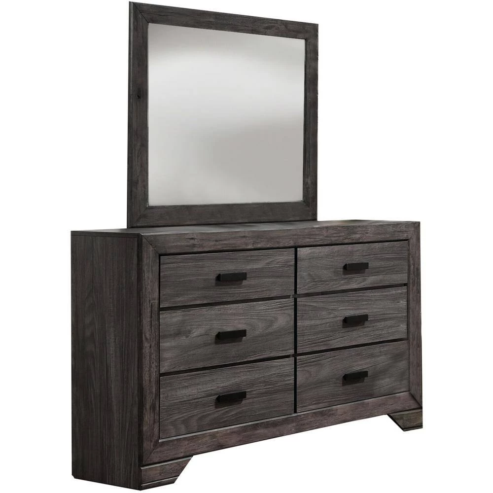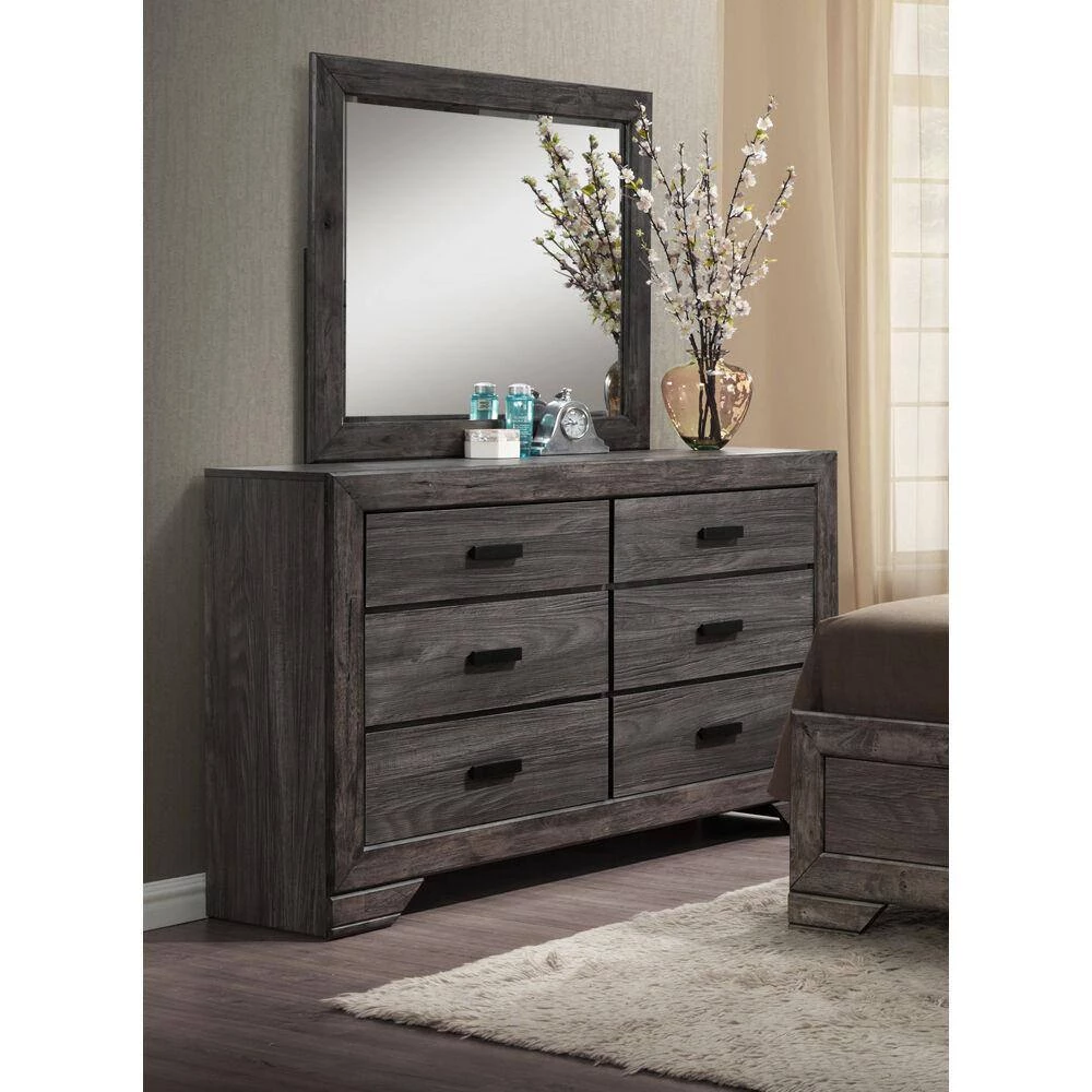- 6-DRAWER DRESSER AND MIRROR: Accented with a distressed woodgrain, this roomy dresser will hold all of your clothes. Dresser dimensions: 63″Wx16″Dx36″H. Beveled mirror dimensions: 42″Wx1″Dx40″H.