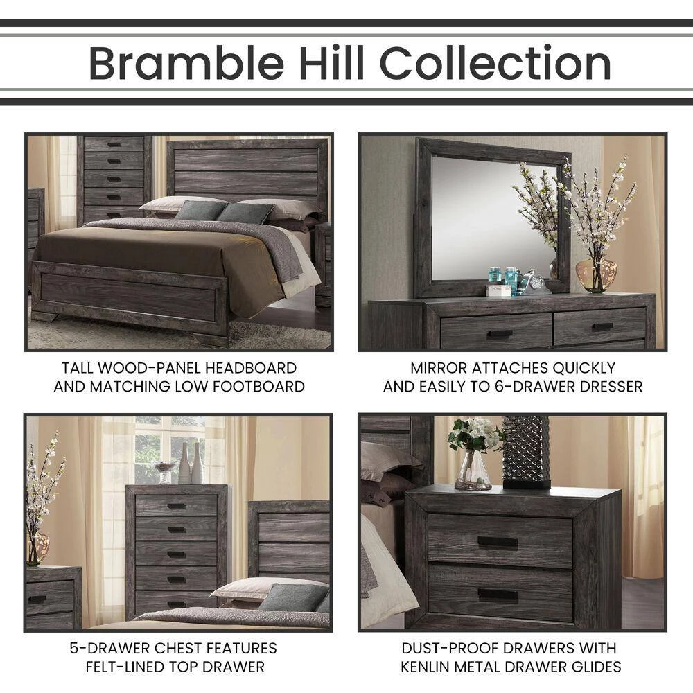Add rustic warmth to any home with the stylish Bramble Hill bedroom collection from Hanover. Our charming farmhouse-inspired furniture features clean lines and a distressed gray finish to match many decor styles. This queen-size set includes a tall wood panel headboard with a low footboard, a roomy 6-drawer dresser with a mirror, a 5-drawer chest and a handy 2-drawer nightstand. Spacious dustproof drawers with Kenlin metal drawer glides and black wood handles offer plenty of room for all your clothes and personal items. From the master bedroom to a guest room, the Bramble Hill bedroom suite will add convenience and stylish comfort to any bedroom setting.