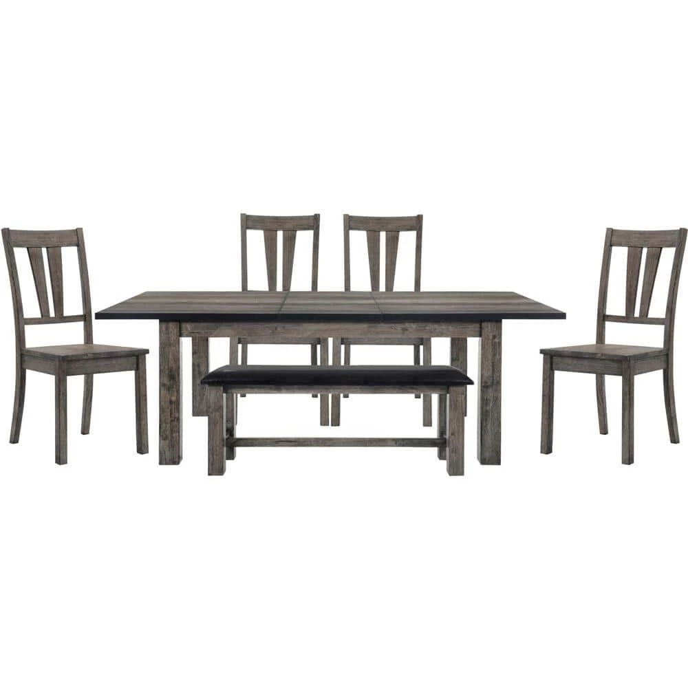 - Complete 6-piece dining set: rustic modern dining set includes an expandable table, 4-side chairs with wood seats, and 1-bench with a faux-leather seat, the transitional design and distressed finish will match many decor styles