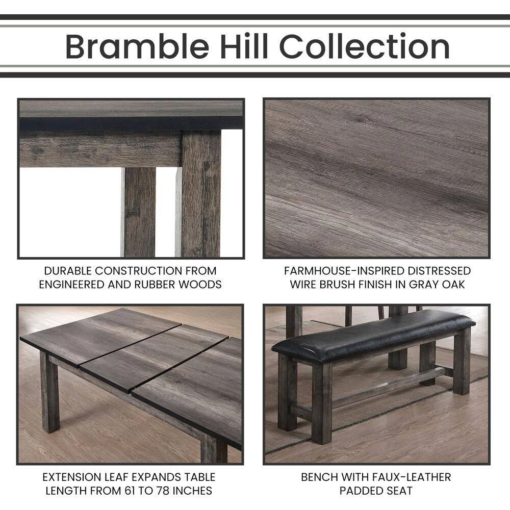 Add rustic warmth to any home with the stylish Bramble Hill dining room collection from Hanover. Our charming farmhouse-inspired furniture features clean lines with square legs and a distressed gray finish to match many decor styles. This 6-piece set includes an expandable table, a faux-leather padded bench, plus 4-side chairs with slat backs and wood seats. With flexibility and convenience in mind, this standard height table includes an extension leaf to expand from 61 to 78 in. long – perfect for entertaining. This amazing set easily seats 6-people in your kitchen, dining room, or breakfast nook. From morning meals to casual lunches to family dinners, you will dine in style with the Bramble Hill dining set.