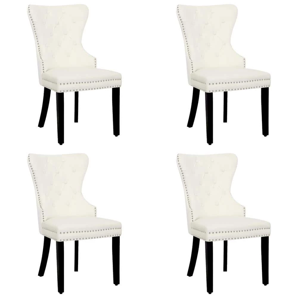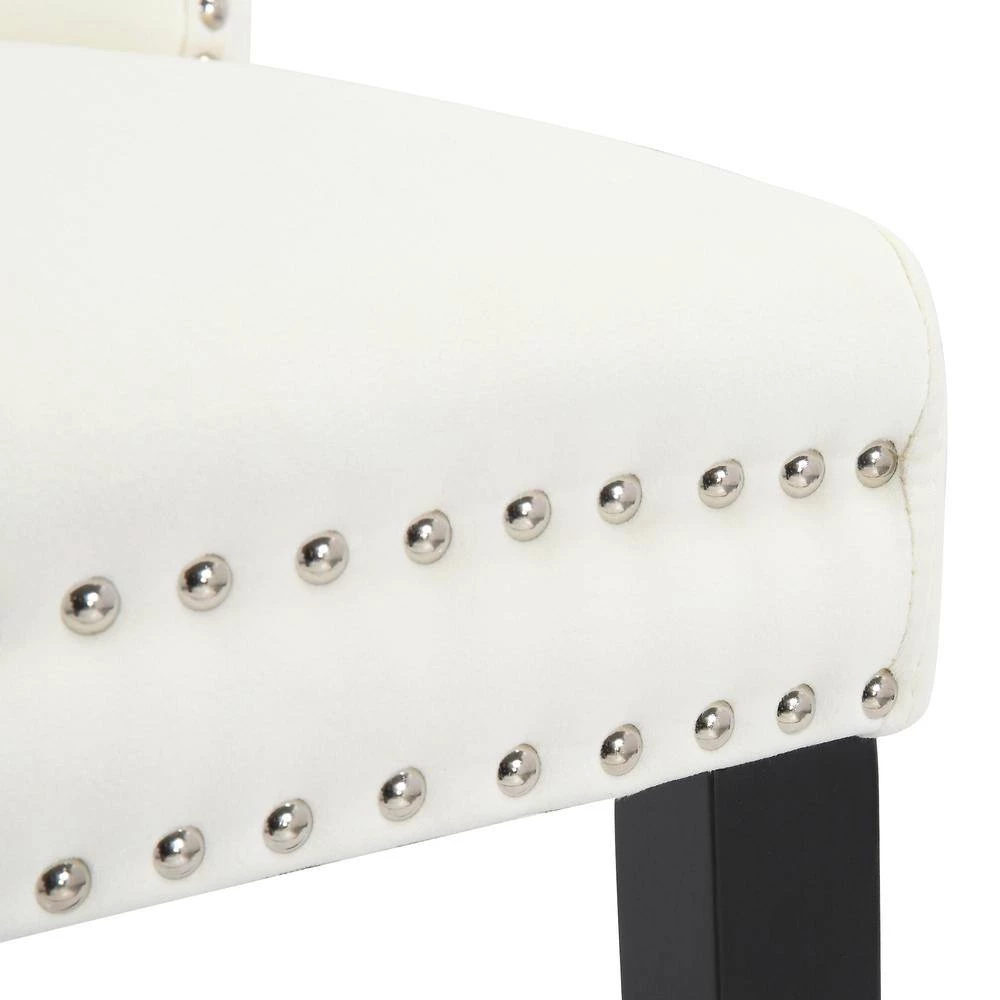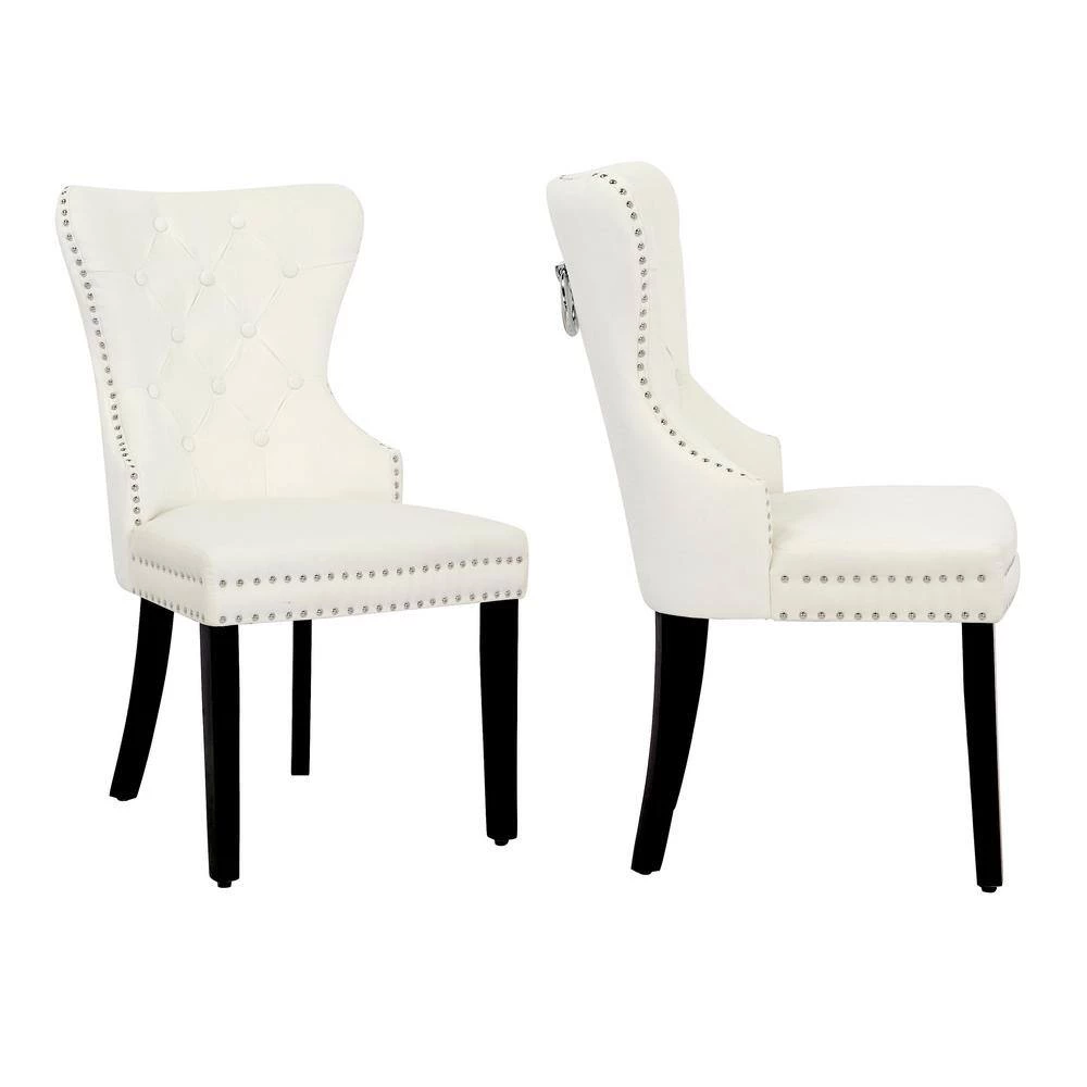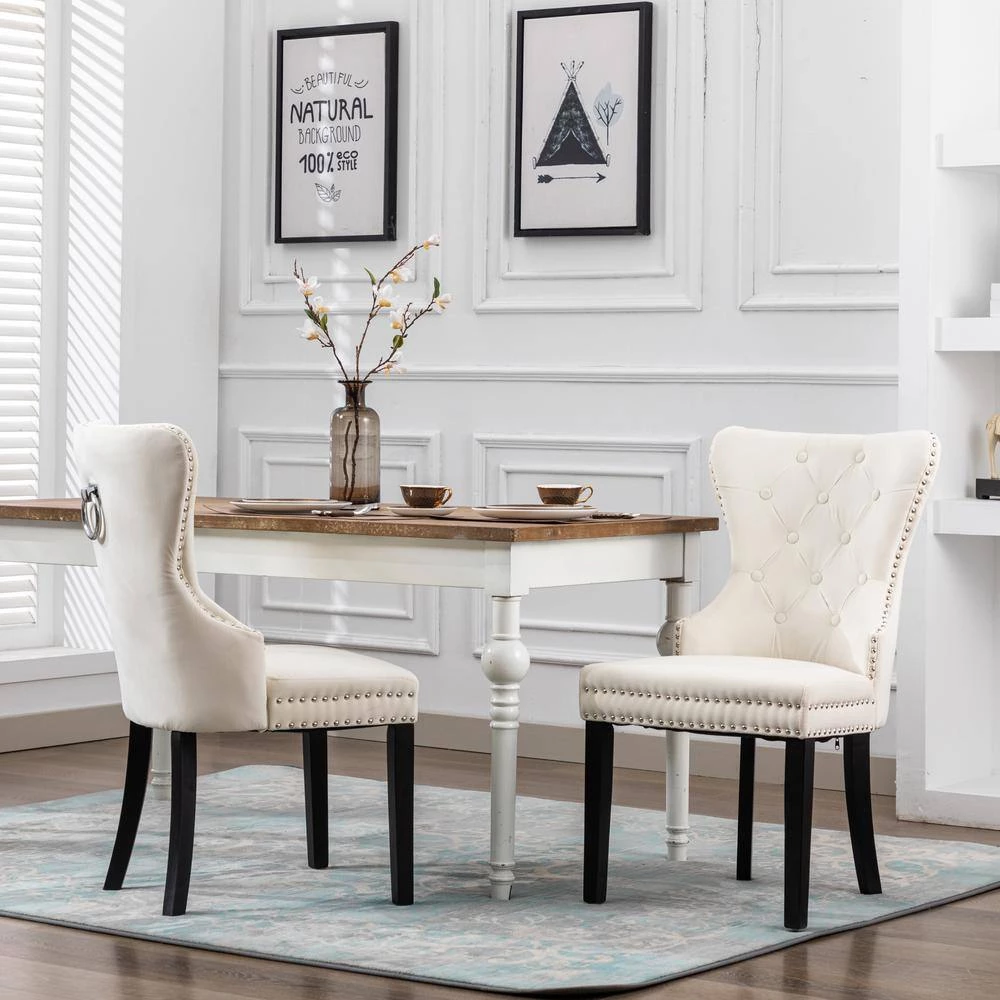 Outfit your dining space with the glamorous set of velvet dining chairs. Constructed with solid-wood legs, this chair is upholstered in a luxury velvet fabric that feels exceptionally soft to the touch. Elegant button tufting accentuates the velvet, while silver nail heads and pull ring add a modern touch to the classic silhouette. This versatile chair makes a comfortable seating option in your dining space, as well as a stylish accent piece in your living room, or entryway.