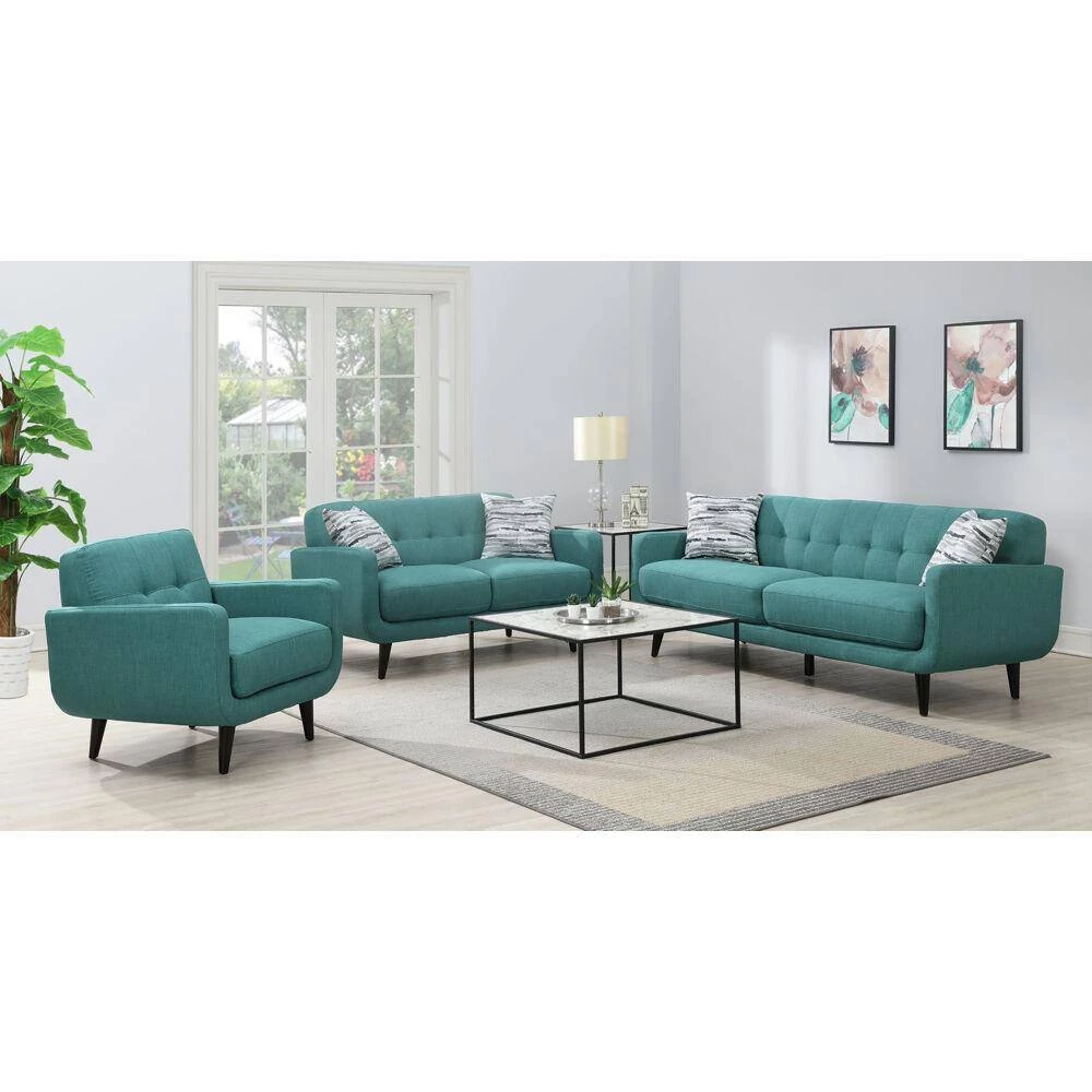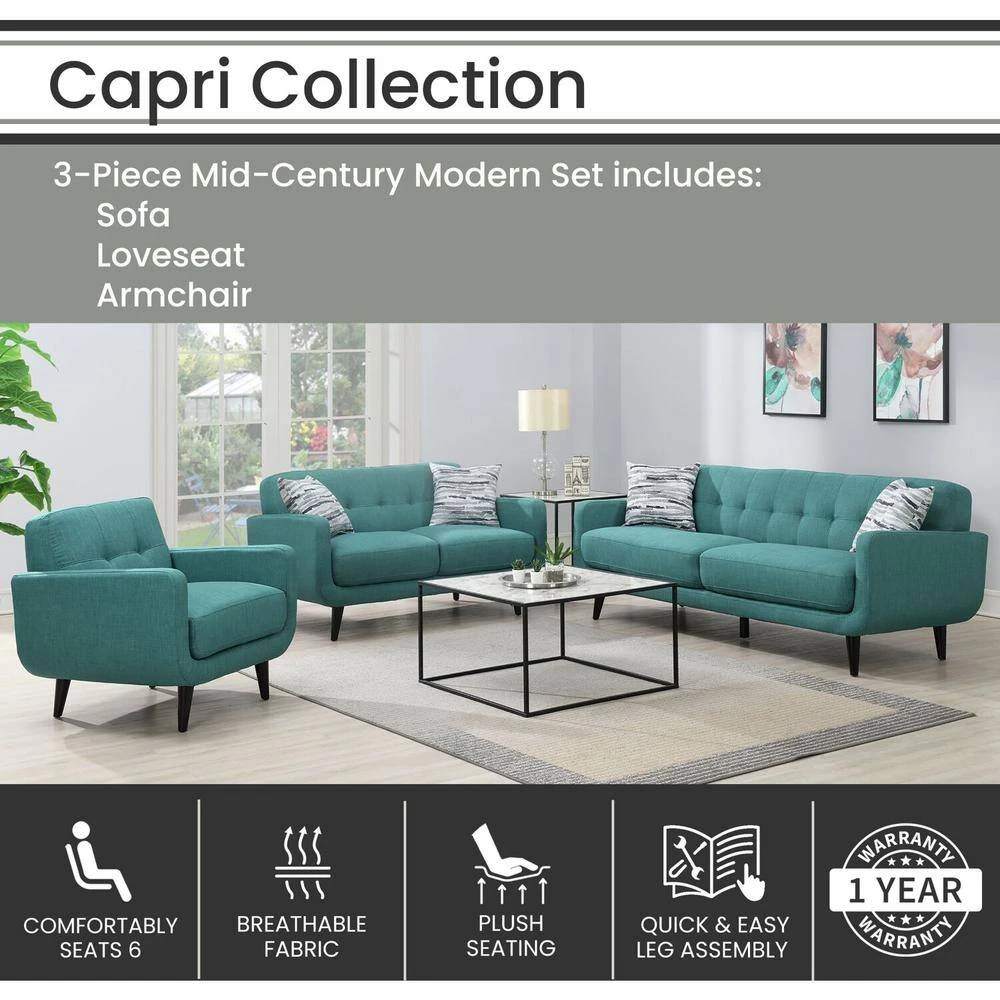 - MODERN DESIGN STYLE: Perfect for relaxing in style, our Capri sofa, loveseat, and chair set features tufted backrests and clean lines. Angled legs and mid-century armrests that will match many decor styles are a chic addition to any home.