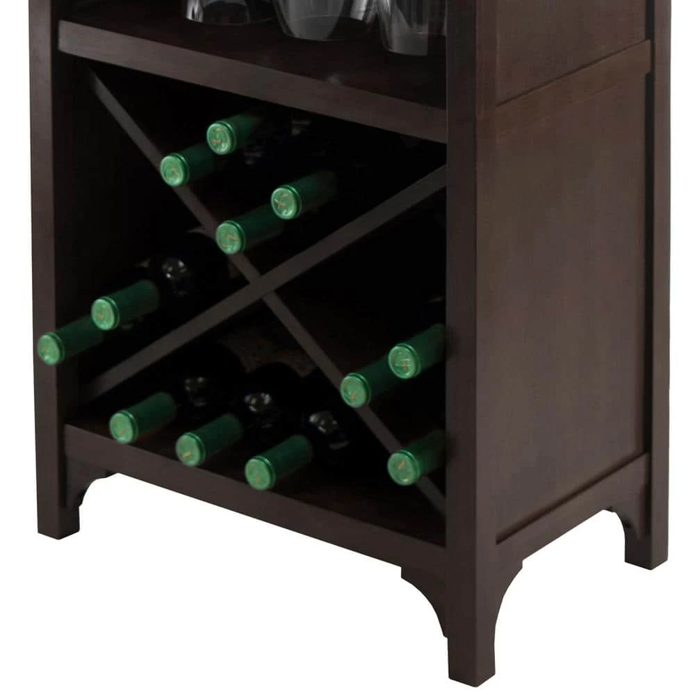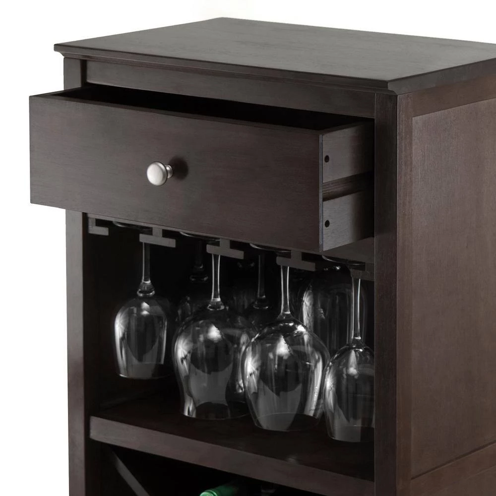 Add this compact Ancona Wine Modular unit to your home. Create a unique look with one unit or any combination of the 3 styles available. This unit has a drawer for your accessories, glass hangers and X wine storage. Overall assembled size is 19.009 in. W x 12.60 in. D x 37.52 in. Insider drawer dimension is 15.47 in. W x 9.25 in. D x 4.65 in. H. Glass Hanger inside clearance is 16.73 in. W x 11.10 in. D x 9.06 in. H. 4 sections of wine storage. Made with combination of solid and composite wood in Dark Espresso Finish.