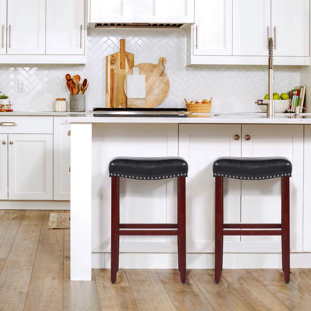 Ideal for your kitchen and home bar, this stool will bring you style and comfort with its well-cushioned saddle upholstered seat. Crafted from high quality solid rubberwod, this bar stool boasts an undestated craftsmanship that makes it perfect for your kitchen, dining room, or bar area. Designed with comfort in mind, indulge yourself in the bar stool’s high denisty foam cushioning. Featuring a linen seat, nail head trim, and a perfectly placed footrest.