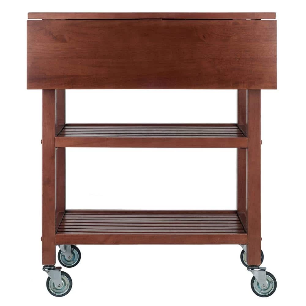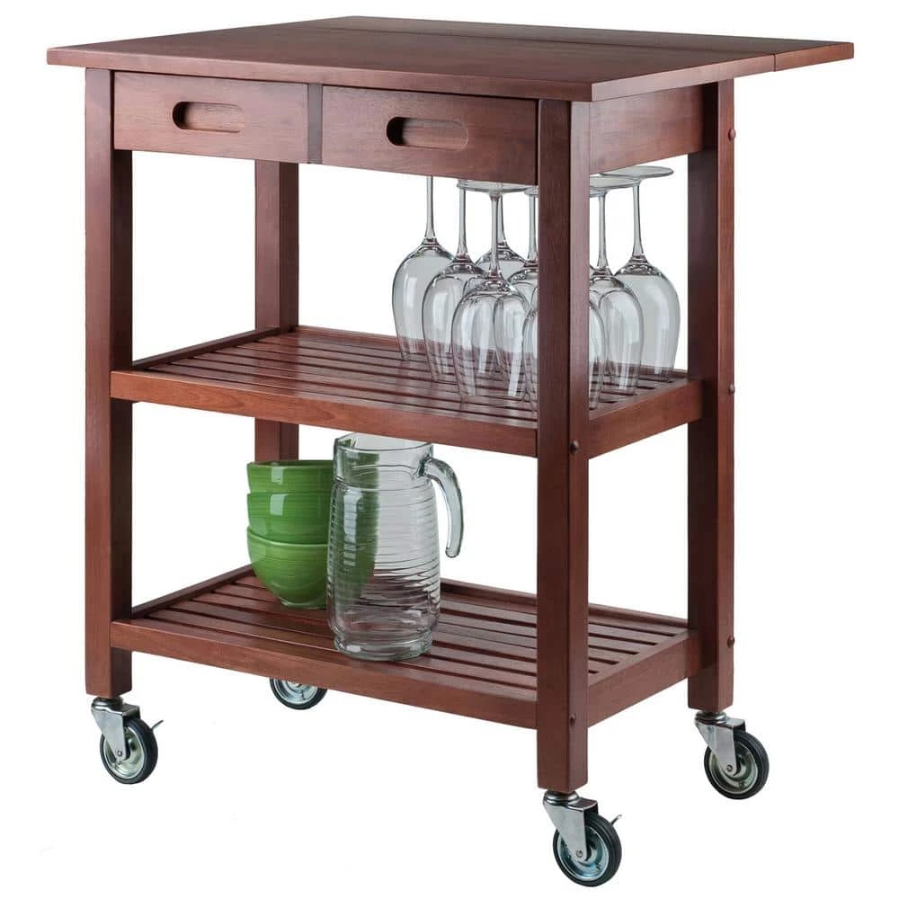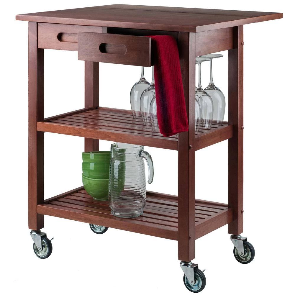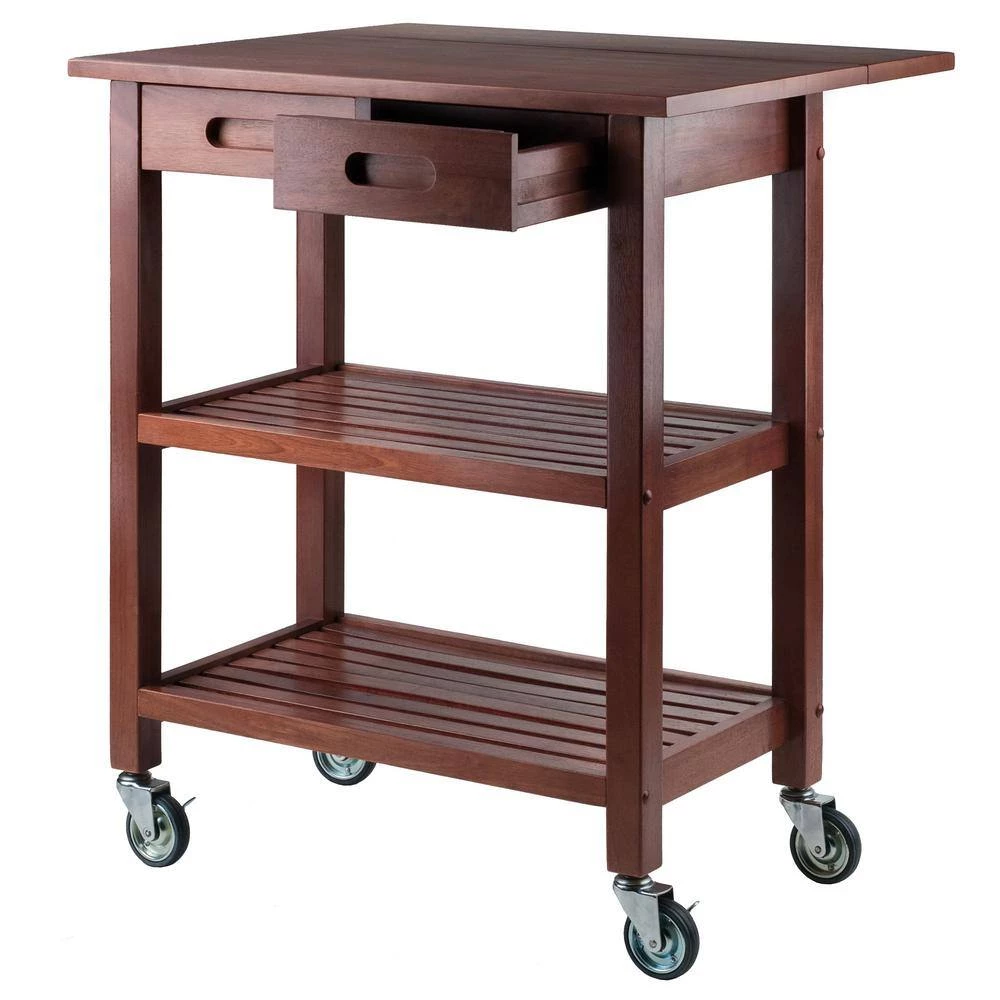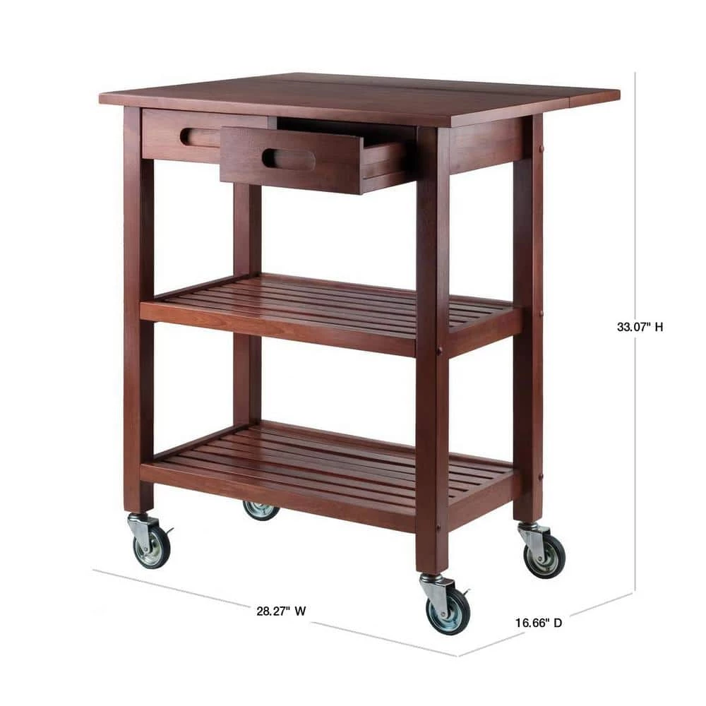Rustic simplicity and function define the Jonathan Kitchen Cart. Handsome and durable, the cart features a drop leaf that adds extra work space when needed. With the drop leaf down, store the cart in a convenient spot. Two slatted shelves are ideal for kitchen utensils, serve ware, mixing bowls, and more. Keep silverware and accessories in the drawers that have cut-out wood handles. The cart rolls easily on professional-grade casters, two of which are locking. Made of solid and composite wood in a rich Walnut finish. Overall size with drop leaf open is 28.2 in. W x 23.6 in. D x 33 in. H. Top with drop leaf closed: 28.2 in. W x 15.7 in. D Table top size is 39.3 in. W and 18.9 in. D, Slatted shelf dimensions: 21.8 in. W x 12.4 in. D Height from middle shelf to drawer: 10.1 in. H Height from bottom shelf to middle shelf: 10 in. H, Inside drawer dimensions: 8.8 in. W x 11.2 in. D 2.4 in. H, Assembly required Ships in 1 box