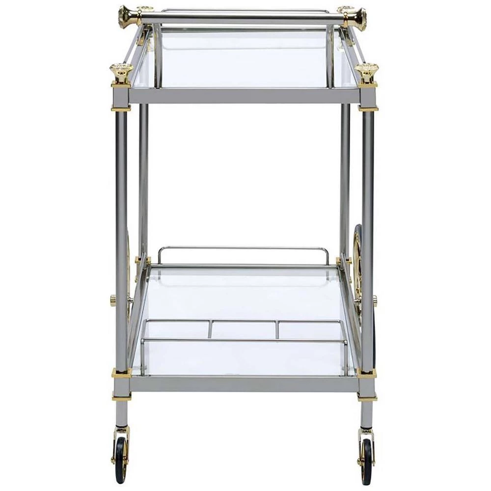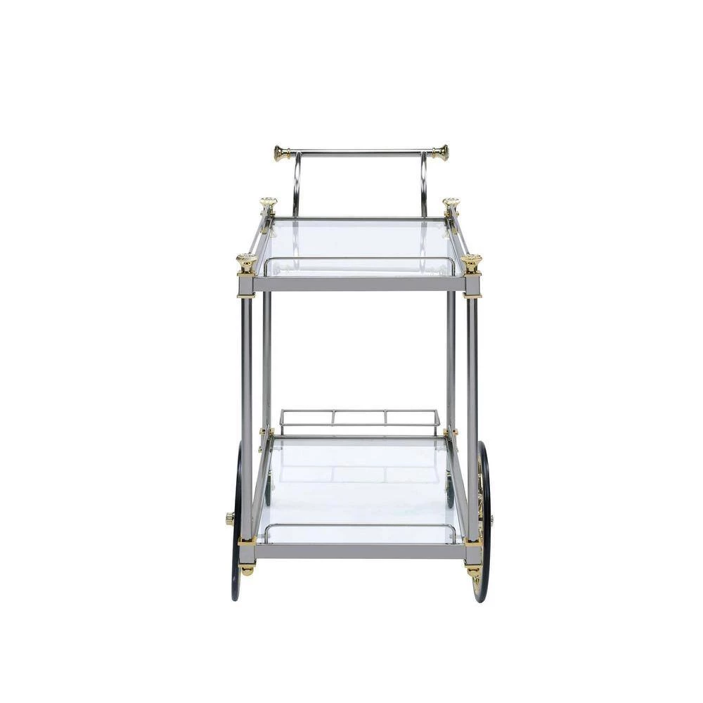 Serve meals fashionably with this lovely Cyrus serving cart. It pairs perfectly with clear tempered glass for a look of refined sophistication. Two tiers easily accommodate trays and entrees, while wheels and a metal handle make it simple to move this dainty design from one place to the next.