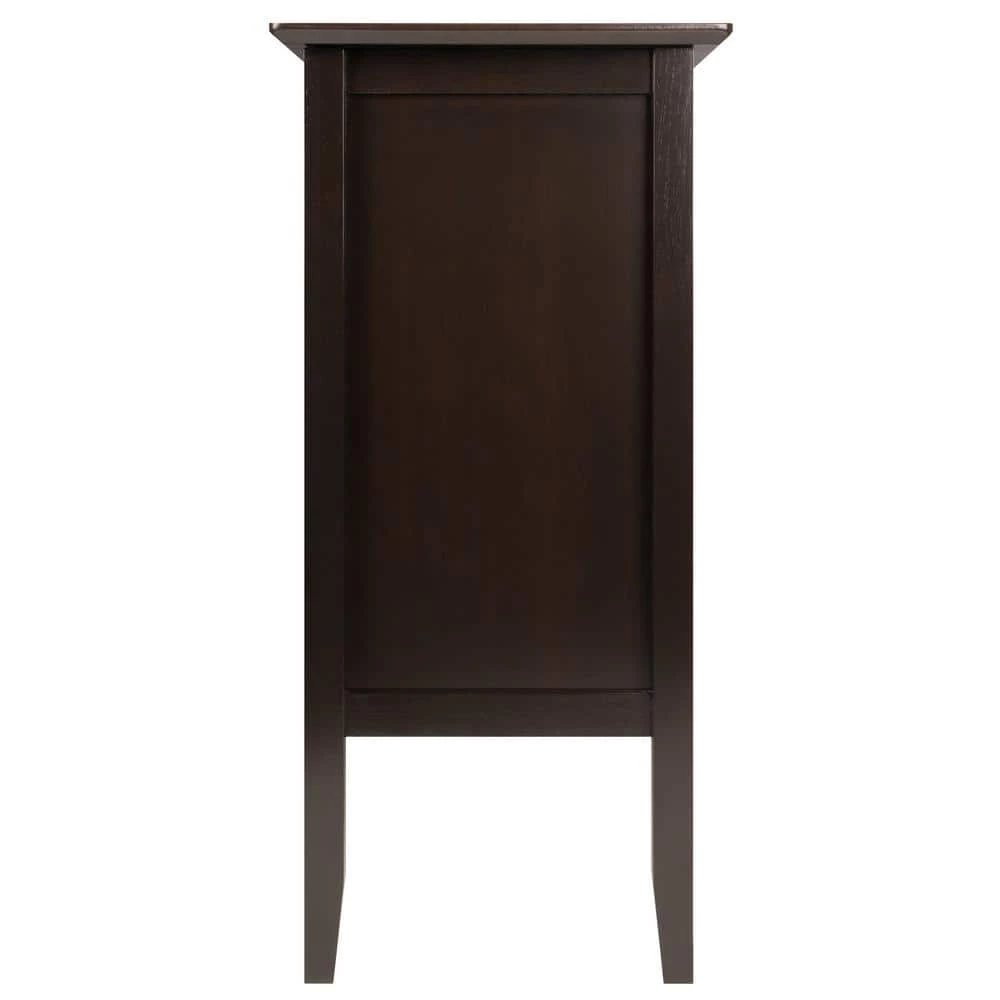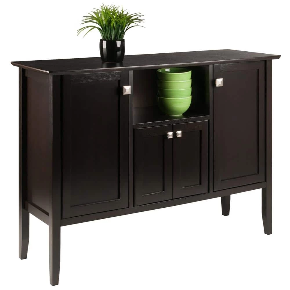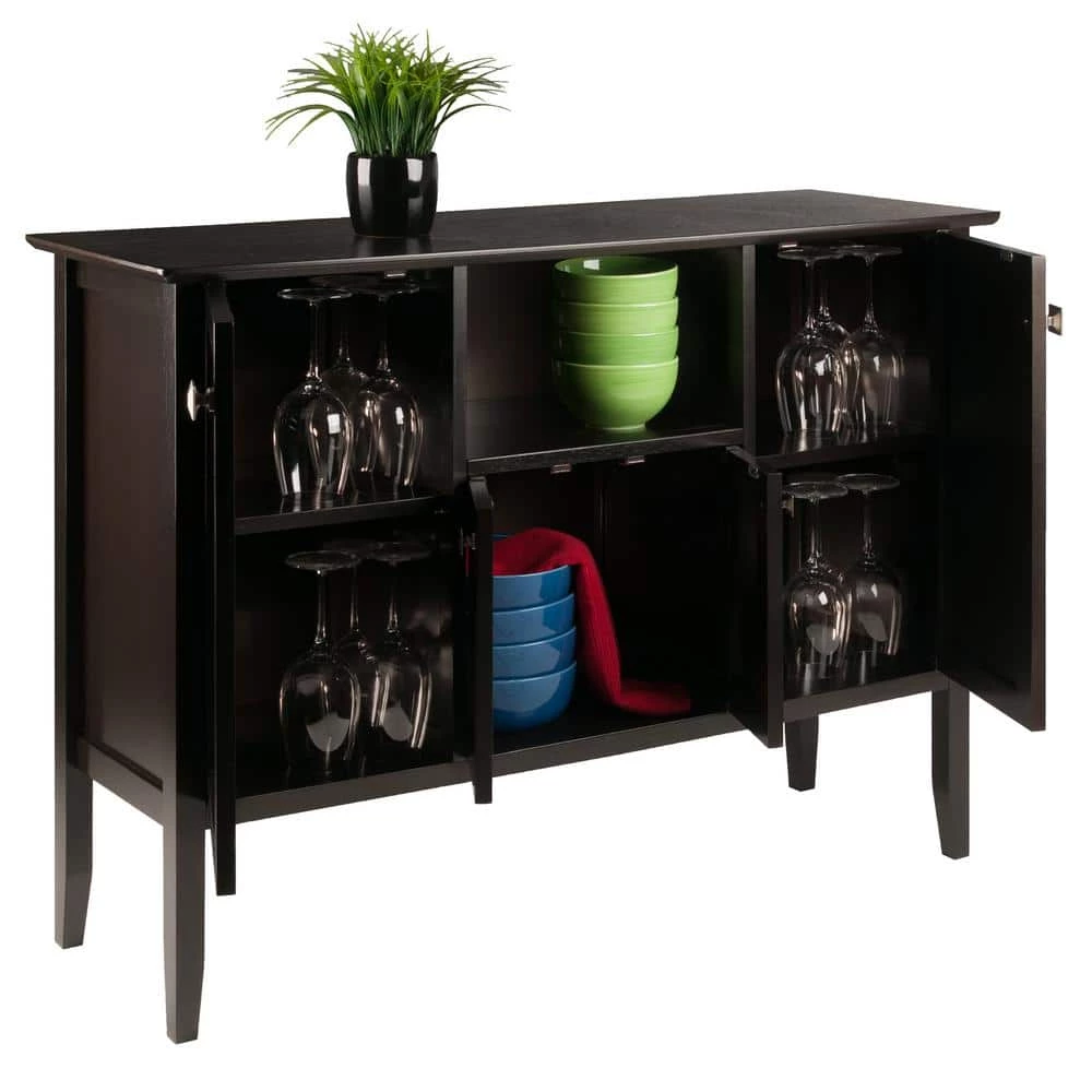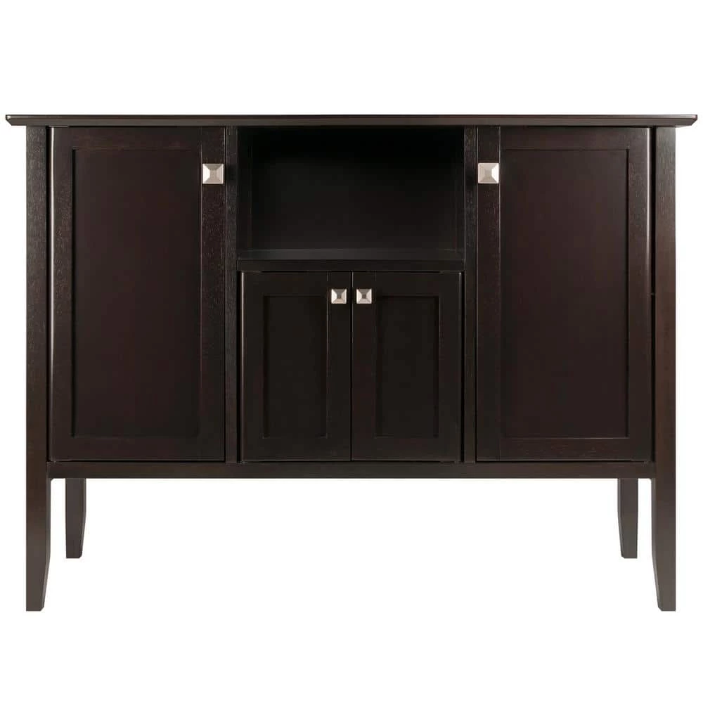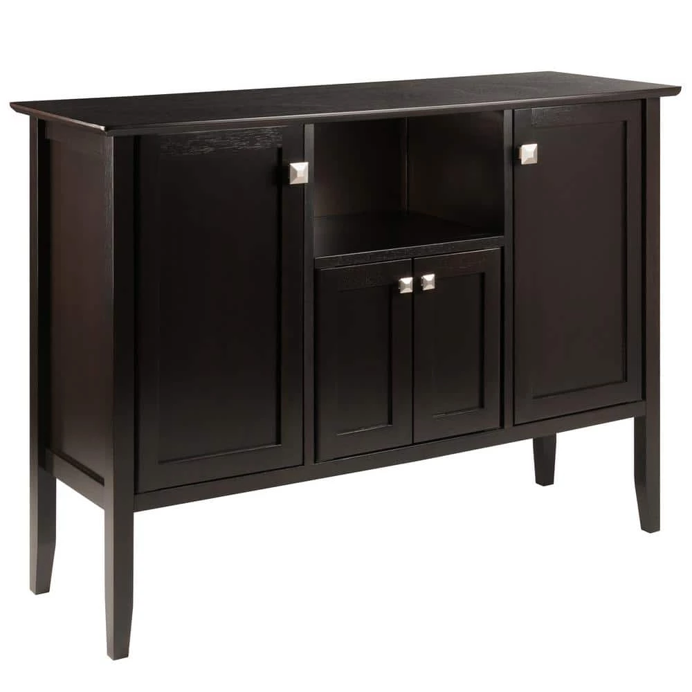 Dress up your dining area, living room or entryway with the melba buffet cabinet. Smart and elegant, the buffet/sideboard features 2 single-door cabinets and an open shelf, plus a center cabinet with double doors. Place it in the dining room to keep your favorite bottles of wine, glassware and dishes. In the living room, the buffet is ideal for having serveware handy while displaying collectibles on the wide tabletop. Or use it as a handsome storage piece in the entryway, keeping keys, gloves, pocketbook or wallet ready to grab as you head out the door. Each single-door cabinet has a removable shelf, providing plenty of space and flexibility to organize a wine bar or storage cabinet. Made of solid and composite wood in a luxurious coffee finish complemented by distinctive square knobs in satin nickel.