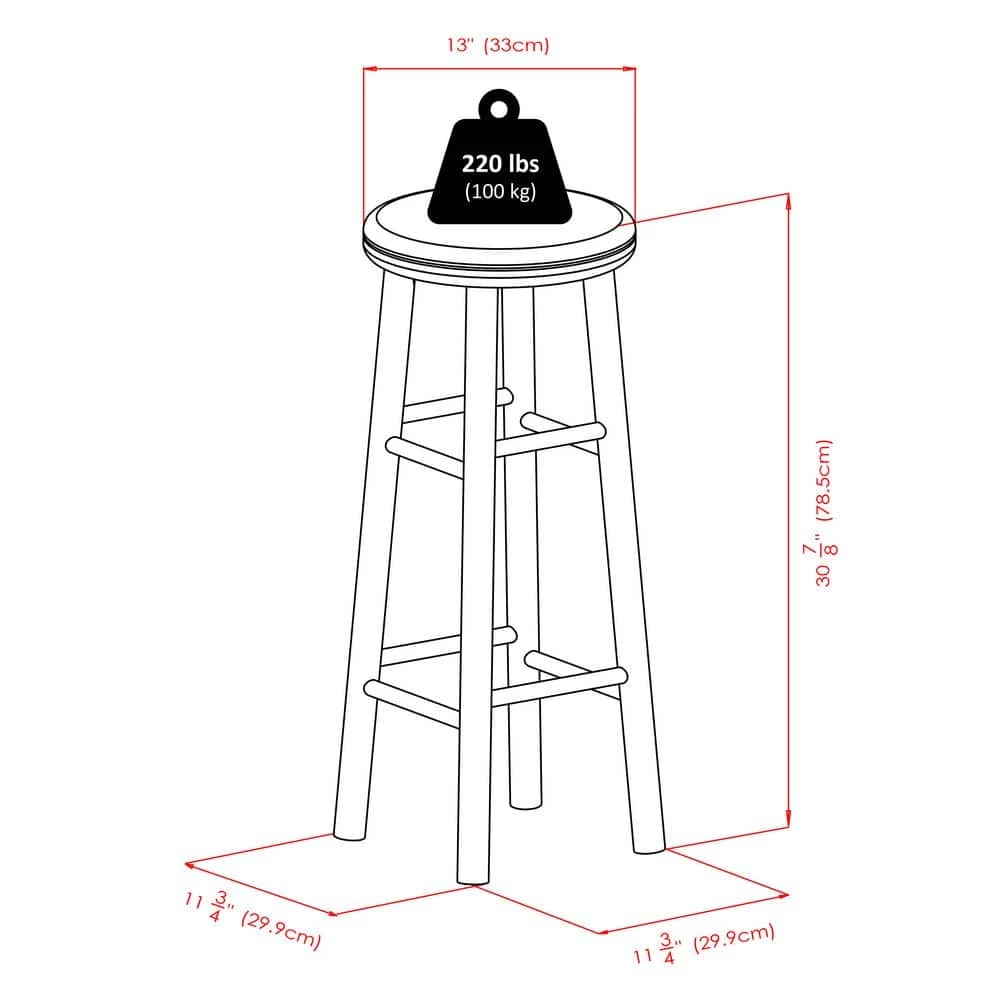 - Overall bar stool size is 13.5 in. W x 13.5 in. D x 30.9 in. H, seat dimension is 13 in. round
