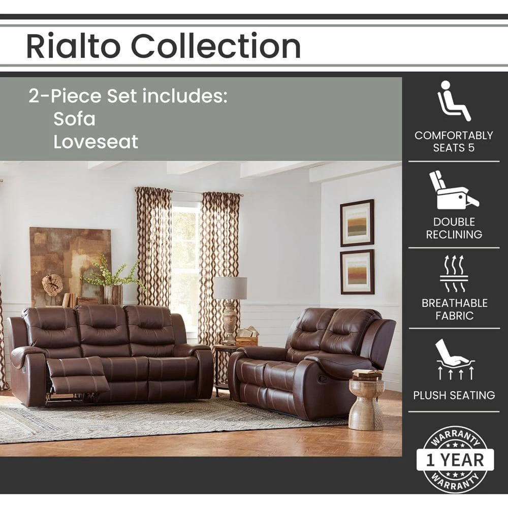 Blending quality, comfort, and style, the Rialto Collection by Hanover will add rustic warmth to any room in your home. Featuring breathable faux-leather fabric and heavy-duty contrast stitching, this double-reclining sofa and loveseat will be part of your movie nights for years to come. The wall-hugging reclining motion takes up minimal space in your living room, family room, or man cave. With double-reclining seats, over-padded arms, and plush deep-seating cushion construction, this family-friendly 2-piece set will become everyone’s favorite lounging spot in the house!