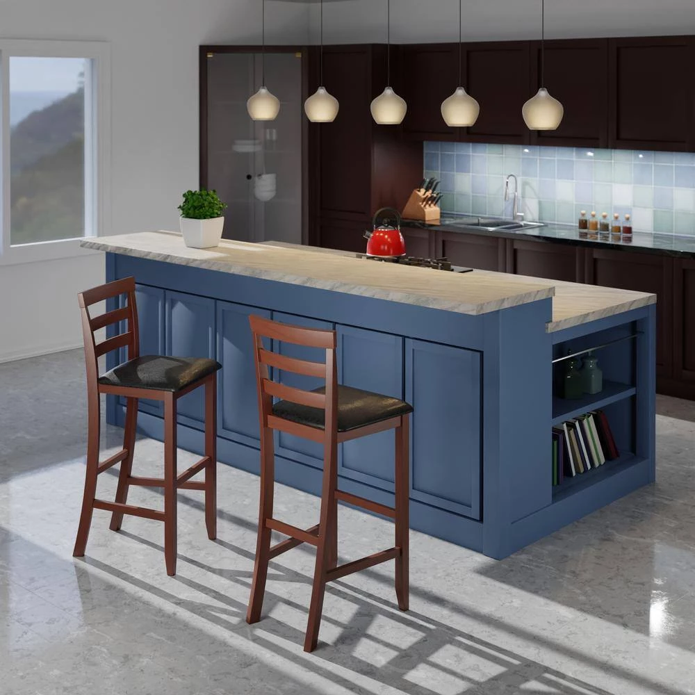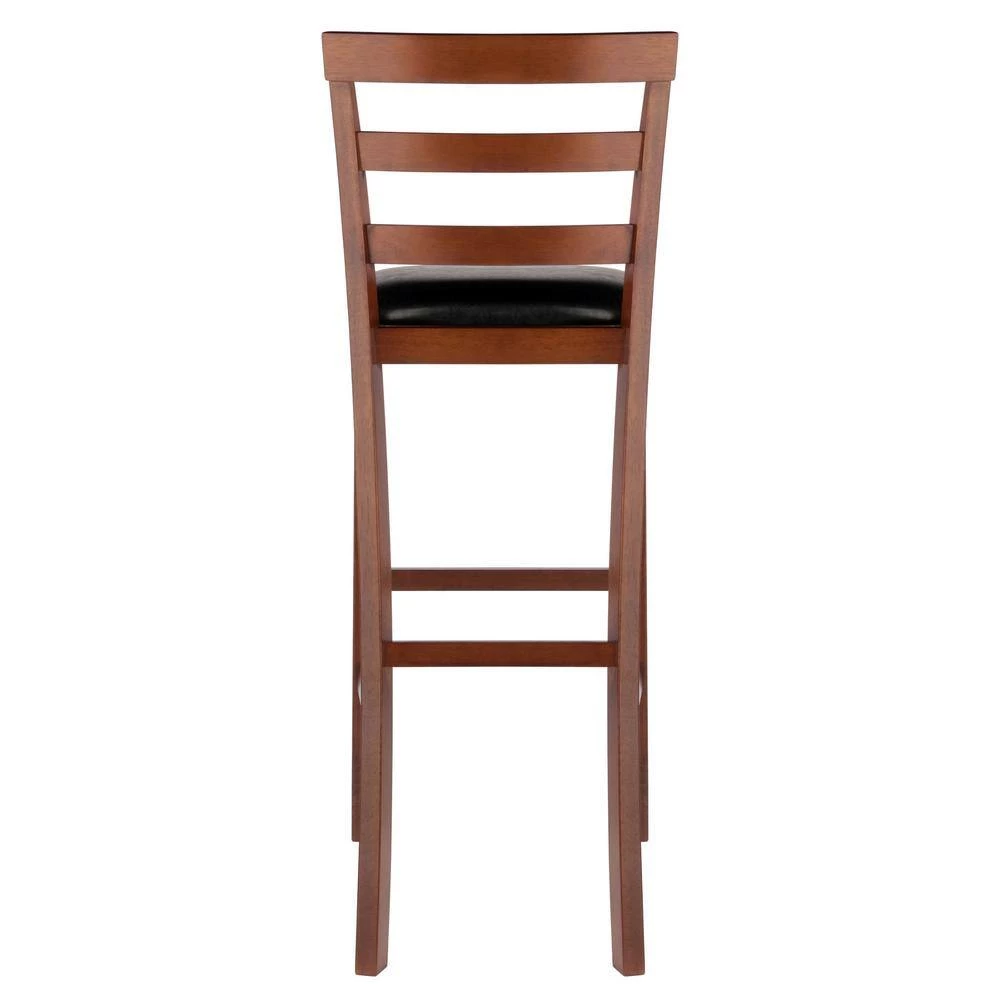 Treat yourself to a touch of luxury along with plenty of comfort in your home bar, den, or family room with the Winsome Simone 2-piece Ladder Back Bar Stool Set. The seats are upholstered in Black Faux Leather and filled with foam cushioning, a perfect compliment to the Solid Wood Walnut chair frames. The simply-styled ladder backs are contoured for ultimate support, and an easy vertical curve continued through the back legs add subtle flair. Stability and comfort are complete in the sturdy legs with structural crossbars that offer built-in footrests. The Bar Stools have seat heights of 30.91 in. H, for relaxing while you watch the big game or dining at a high table. Also available in a 25 in. H, Counter Stool height. The 2-piece set is conveniently packed and shipped in 1 box that includes the hardware needed for assembly. Replacement part request can be submitted directly to the manufacturer within 60 days from date of purchase. Overall size: 17 in. W x 10.06 in. D x 43.12 in. H, Seat height from floor: 30.91 in. H, Seat dimensions: 14.52 in. -16.93 in. W x 15.75 in. D Back height: 12.03 in. H, Back width: 17 in. W Static weight capacity: 220 lbs. Distance from seat to front footrest: 21.57 in. H, Distance from seat to side footrests: 16.69 in. H, Leg footprint: between front legs: 15.83 in. W between front and back legs: 19.07 in. W Assembly required Ships in 1 box.