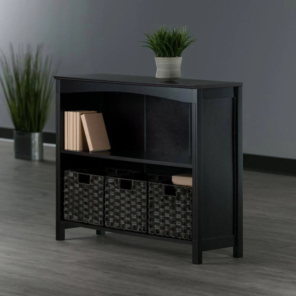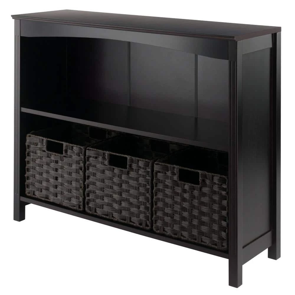 Enhance the appearance of any room with the simple yet attractive design of the Winsome Wood Terrace 4-Piece Storage Shelf Set. Spacious shelf perfect as a standalone bookcase in the home office or displaying family portraits and treasures in the living room. Finished in a rich espresso and made of solid and composite wood for, long-lasting durability. The set of baskets are woven in durable flat polypropylene in a chocolate finish and have 2 cut out handles, one on each end, for, carrying purposes. Prompt up and these baskets measure 10.24 in. W x 11.02 in. D bringing charm and style. When not in use, they fold for, easy storage taking up almost no space. This set is shipped in 2-boxes. The shelf will ship separately and will include the hardware necessary for, assembly. Replacement parts Can be requested directly to the manufacturer within 60 days from date of purchase.