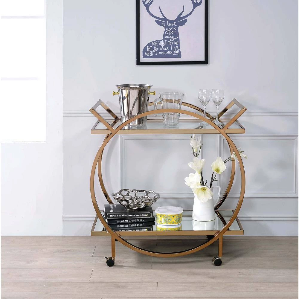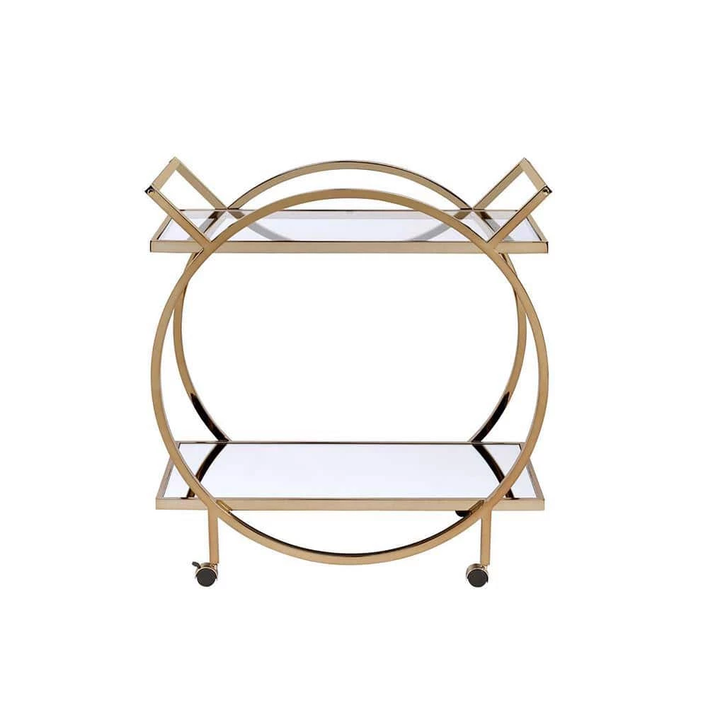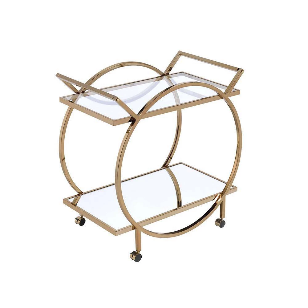 Roll out an artful decor anywhere in your home with this Traverse serving cart. The beautiful frame is crafted with quality metal tube and finished in elegant champagne. With the glass top shelf and mirrored bottom shelf, its timeless design will liven up the entire atmosphere.