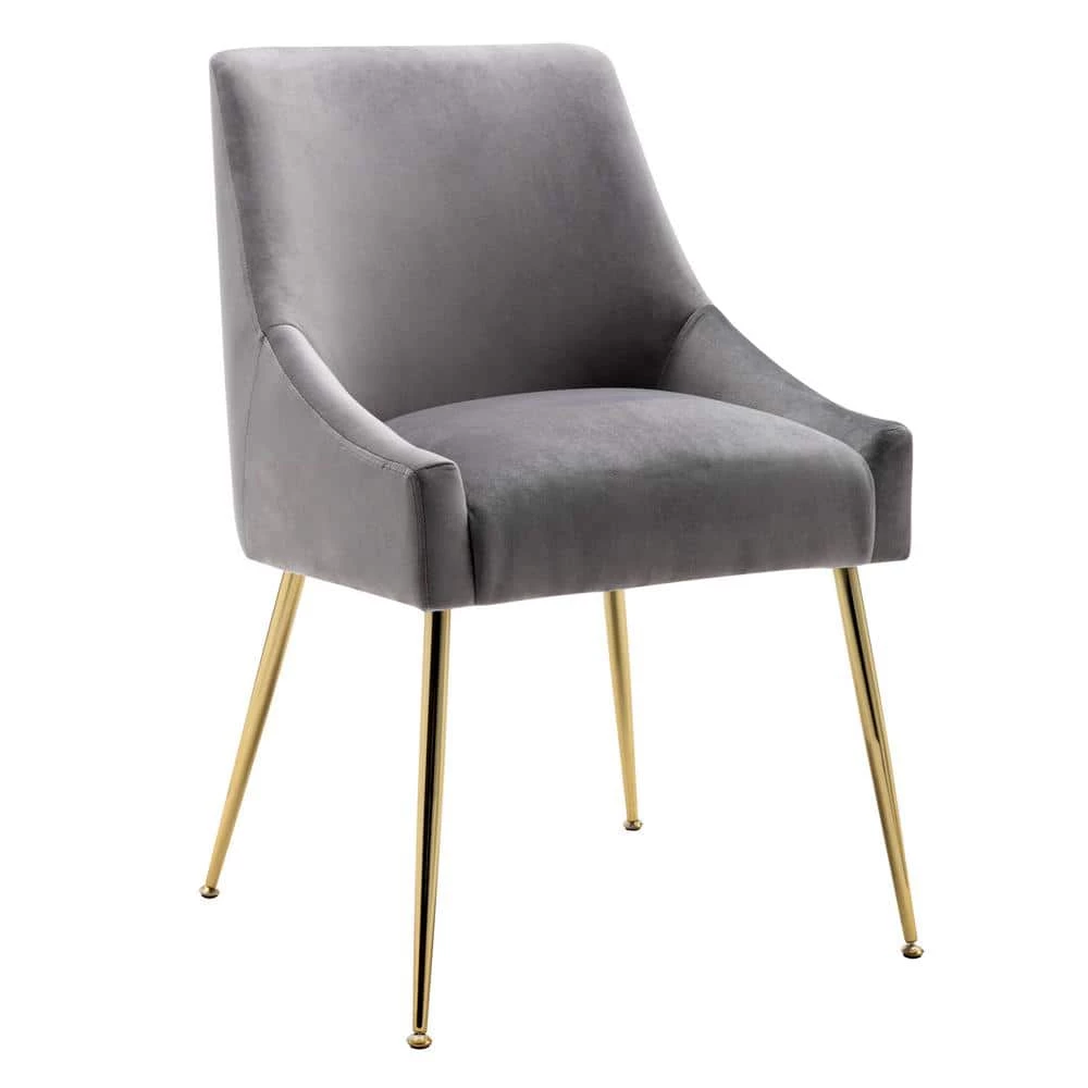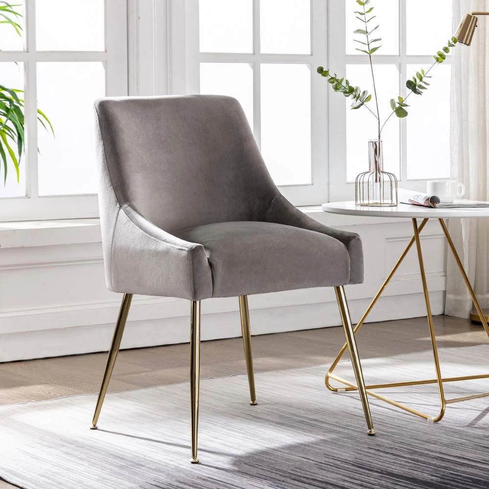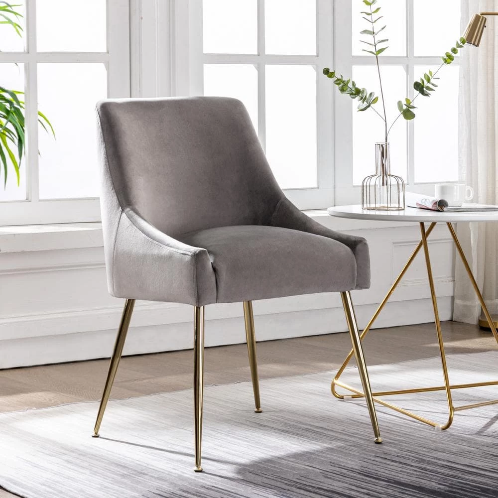 The simple velvet design will add a touch of glam to your living or dining room. Built with a solid wood frame that sits on metal legs, its upholstered in soft velvet fabric. It features low recessed arms and a curved back. The flared metal legs show off a subtle mid-century modern look and a luminous gold finish for a luxe feel. The added gold accent bar on the back adds the perfect touch of detail and helps you move the chair.