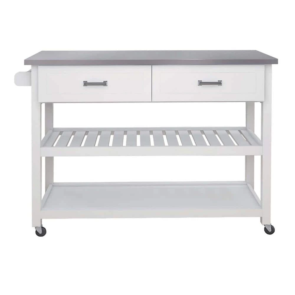 Special design:Special stainless steel table top, even If the kitchen trolley often placed wet dishes or fresh vegetables , the stainless steel top is not perishable and leave traces, and very easy to clean.This kitchen cart comes with 2 drawers for you to keep tableware, like spoon or fork.2 opening shelves under the drawer can put some other bigger items which you are often used.It is perfect choice for your kitchen.