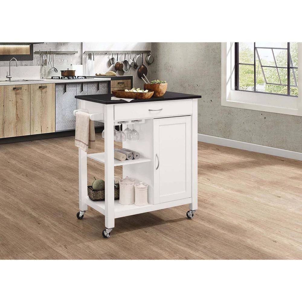 Our Ottawa kitchen cart covers your need for storage and more. This multifunctional kitchen cabinet is a freestanding island that features four wheels for legs, each with a locking feature so it doesn’t slip away while you are chopping fresh herbs and veggies. A towel bar, cabinet with concealed shelf, wine rack shelf, and two open shelves provide plentiful space for cookware, non-perishables, and sundries. The frame is made with white finish, and topping this is a beautiful black countertop. Some Assembly Required. It is perfect choice for your kitchen!
